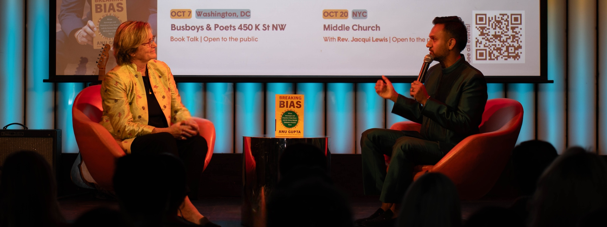 Reading or listening to sections of Breaking Bias; Completing a journaling exercise; Attending facilitated sessions with Anu for reflection, dialogue, Q&A, and integrationBetween Sessions: